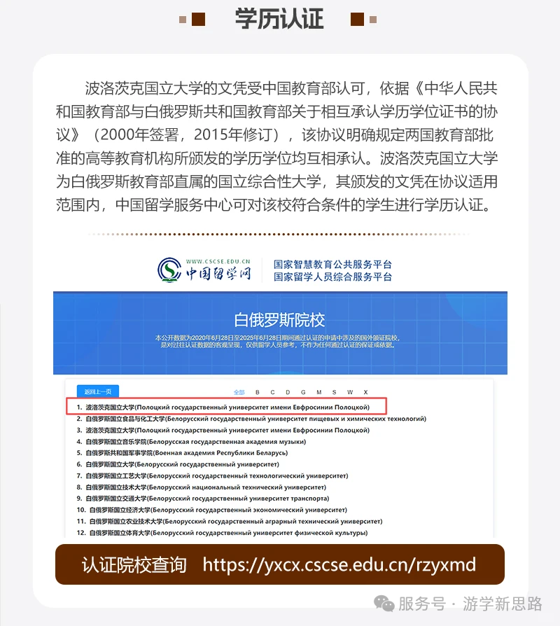 相比一些欧美国家,申请条件友好,给更多同学留学深造的机会~ • 国际化氛围:学校现有6000多名学生,其中20%以上是来自19个不同国家的留学生 ,多元文化交流碰撞,拓宽国际视野! • 费用亲民:留学成本较低,无论是学费还是生活开销,性价比超高💰 它始建于1581年,坐落在白俄罗斯最古老的城市波洛茨克 ,是白俄罗斯最大的国立区域性综合大学,在全国50多所高等教育机构中排名第8 ,传承着几百年的欧式教学传统~ 这里有超多热门专业可供申请: • 金融经济类 • 教育心理类 • 法学类 还有物流学、语言学、计算机科学与编程技术 、信息安全、建筑学等专业,满足不同的学术追求! 专升本:专升本阶段为1.5年 3个学期,可以接收非全学历的学生,非全2.5年的学生也是可以读1.5年专升本,凑够10个人开班。 硕士:学制1-2年,入学时间3月和9月,学费3980美金 国内地址:中国洛阳西工区唐宫中路京都大厦15楼1502室